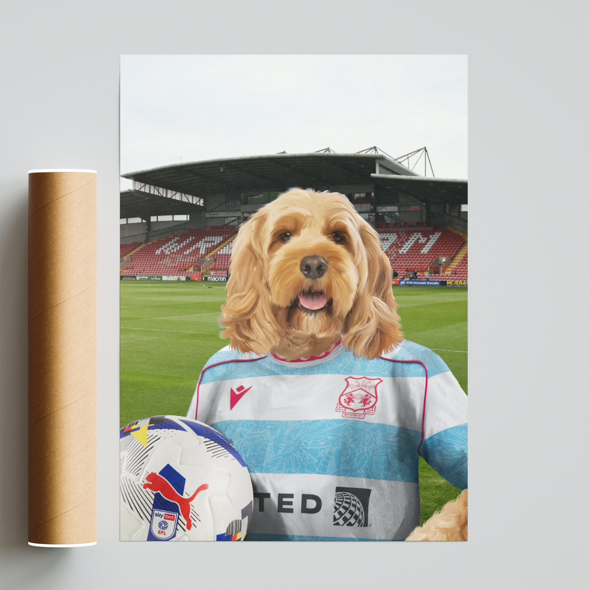 Get your pet illustrated in anOfficial Wrexham 3rd ShirtinsideThe Racecourse Ground – fully licensed byWrexham Football Club. Each design is carefully crafted to capture your pet’s personality and detail.